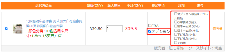 ご自宅へ送る商品にオプションが必要な場合、「オプション選択」をチェックし、「代理購入依頼をご提出」ボタンをクリックしてください。