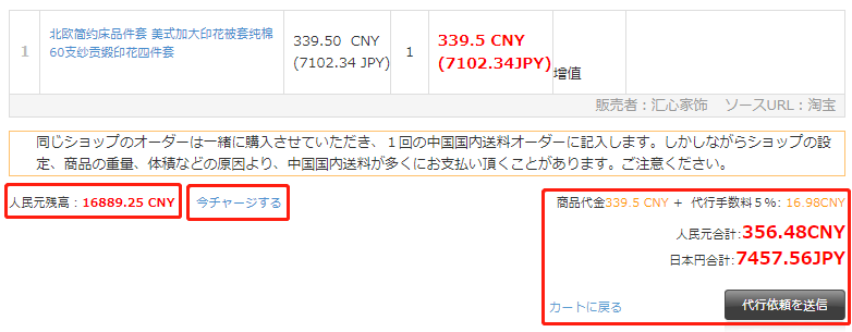 「代理購入依頼をご提出」ボタンをクリックし、下記のページへ移動後、今回代理購入をご依頼される商品が閲覧できます。オプション検品などの必要性を再度ご確認していただき、もう一度「代理購入依頼をご提出」ボタンをクリックすると、お支払いが完了し、代理購入確定となります。お支払いは事前にチャージしたお金から引き落とされます。
