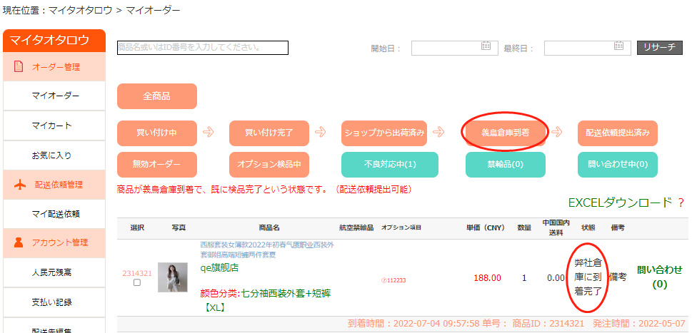 ※購入状態はオーダーステータスで確認出来ます、具体的な内容はマイオーダーをご確認ください。「義烏倉庫到着」と記載されている商品は配送依頼を提出することで出荷されます。