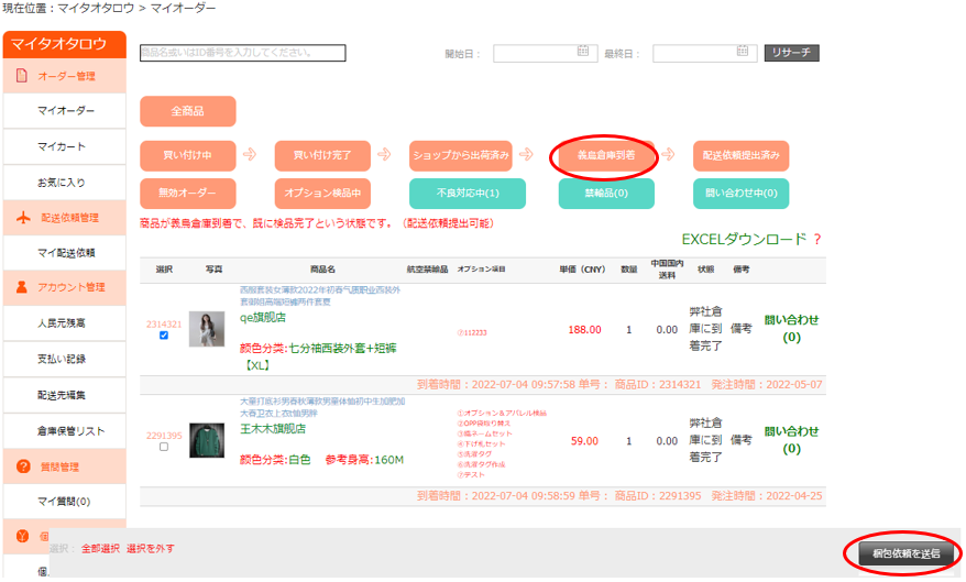 到着済みの商品は、「義烏倉庫到着」オーダーページで選択する事で配送依頼を提出することが可能になります。