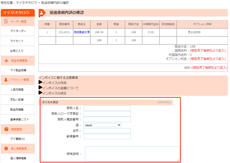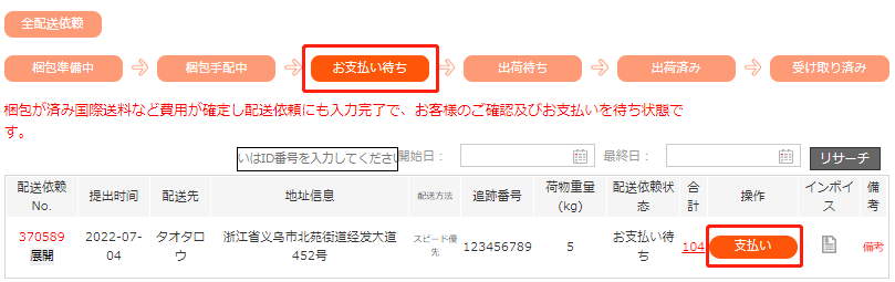 手配完了後、弊社スタッフにて商品の重量と送料を計算し、配送依頼に記入後、配送依頼の状態が「お支払い待ち」に変更致します。また、お客様が登録したメールアドレスにもメールにてご報告致します。なお、インボイスはメールに添付致します。