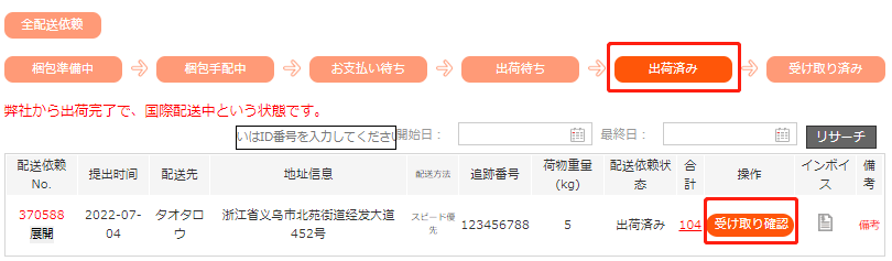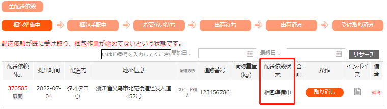 配送依頼の手配が始まりましたら、配送依頼の状態を「梱包手配中」に変更致します。