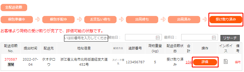 商品をお受け取りになりましたら「受け取り確認」ボタンのクリックをお願い致します。あわせて、今回のサービスの評価もお願いいたします。
